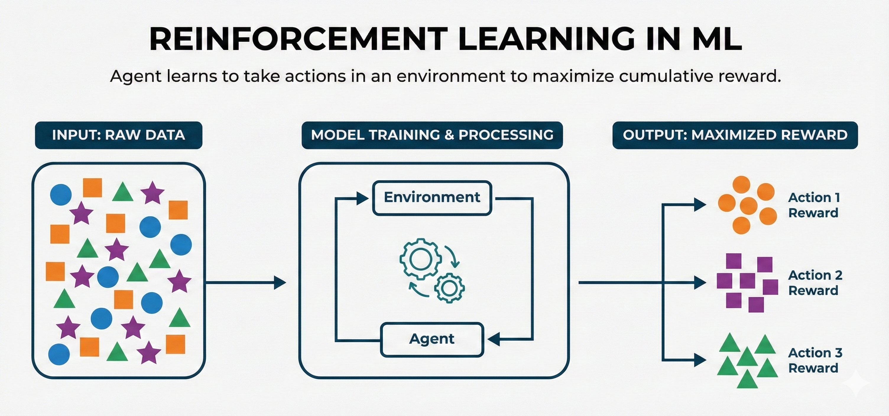 - An agent learns by taking actions in an environment and receiving rewards or penalties.