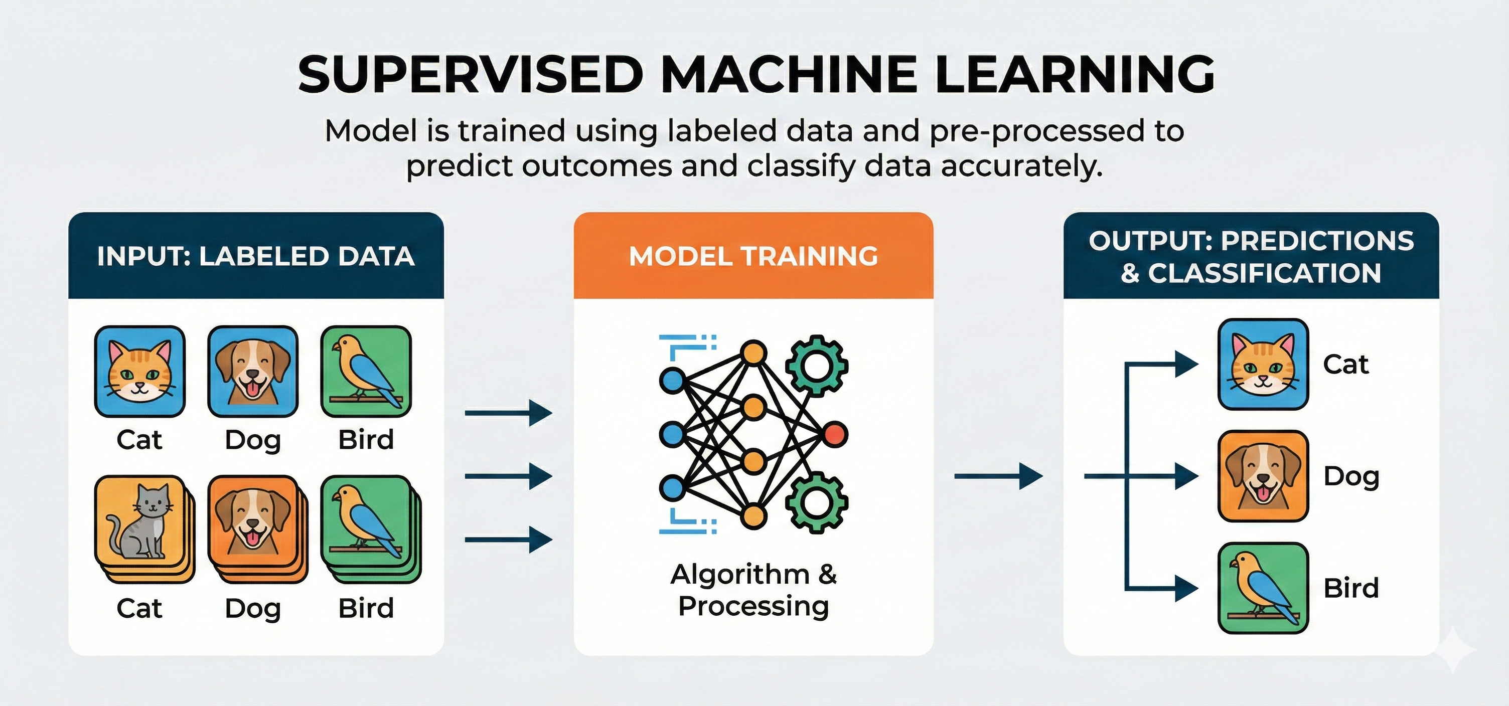 - Trains on labeled data where both input (x) and target output (y) are known.